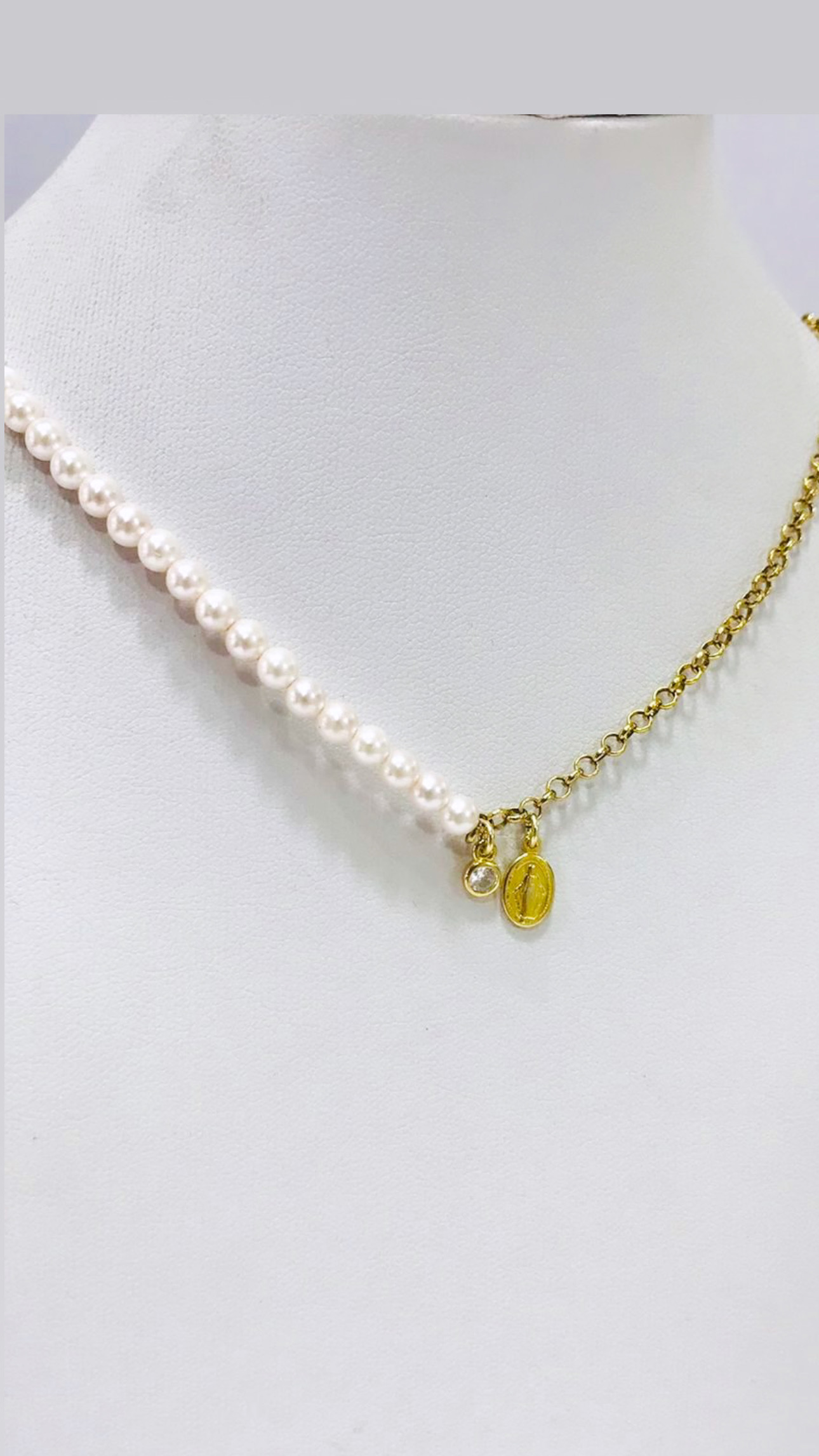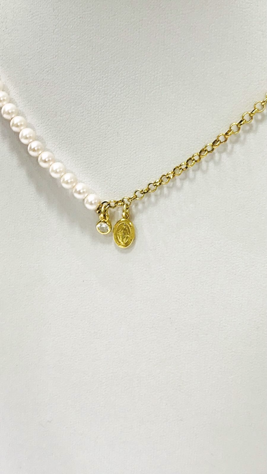 Collar plata 925 goldplated perla , Virgen Milagrosa , Punto de luz .
