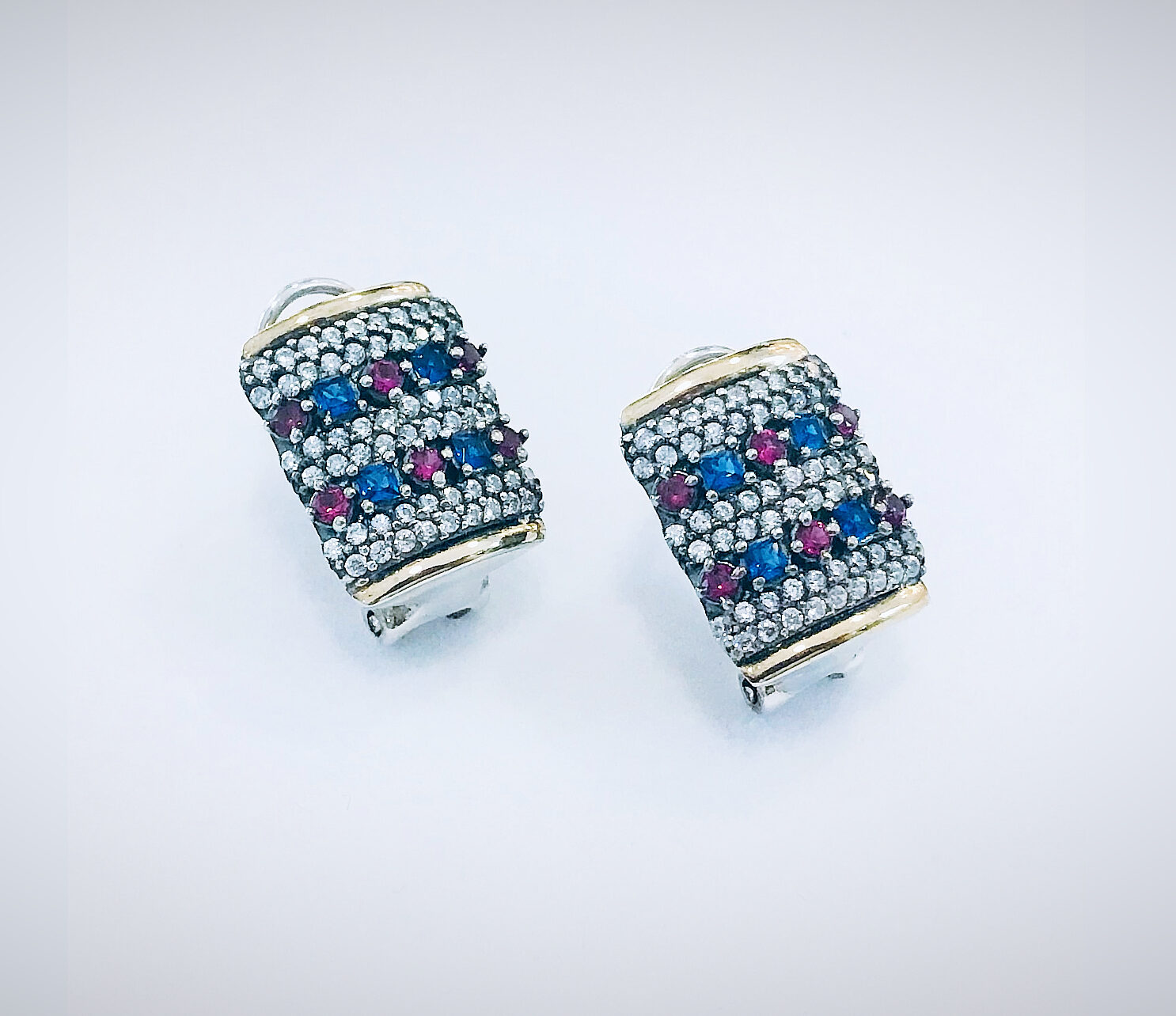 Par caravanas plata y oro cristal azul, rojo y blanco