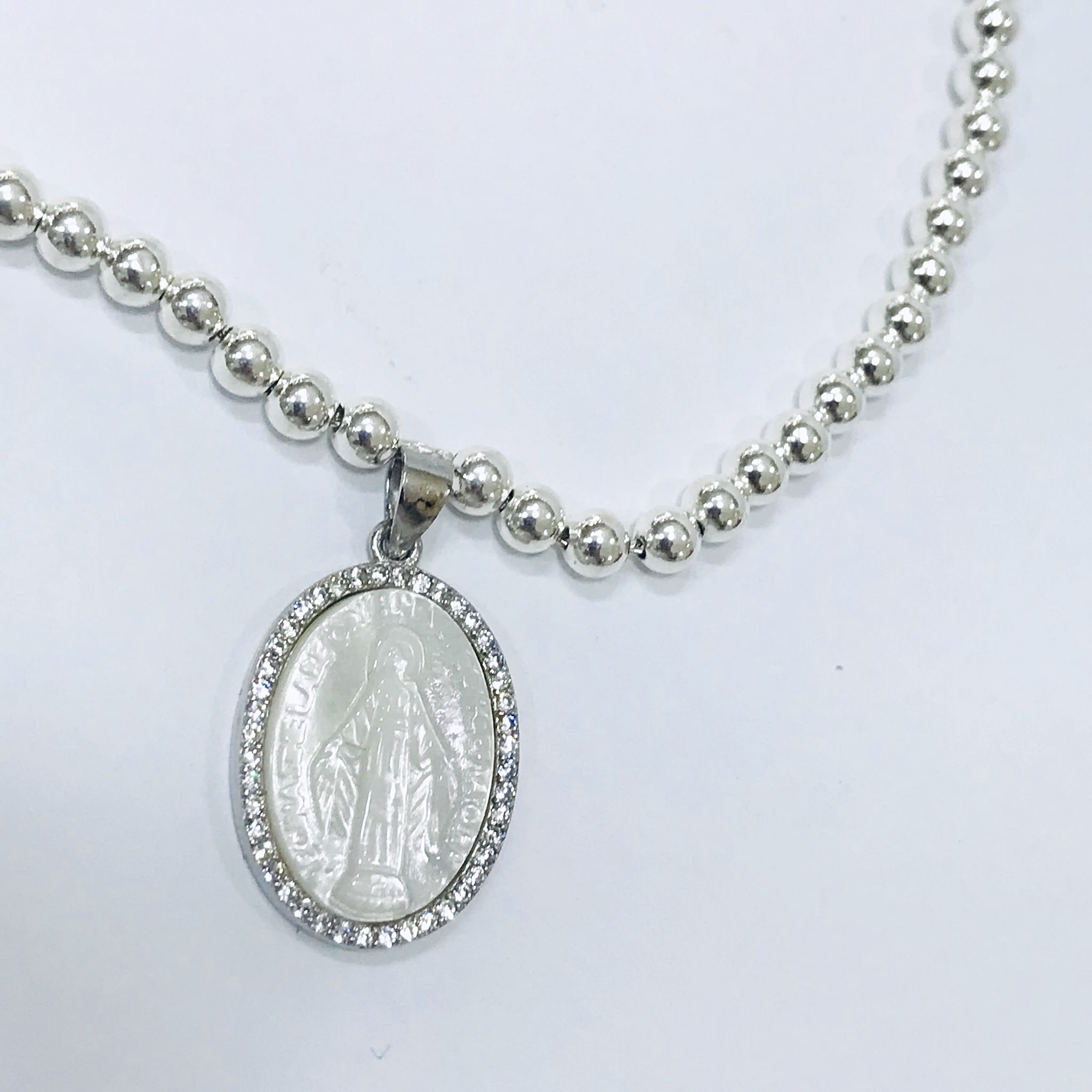 Medalla plata 925, nacar imagen Virgen Milagrosa borde diamantinas italianas