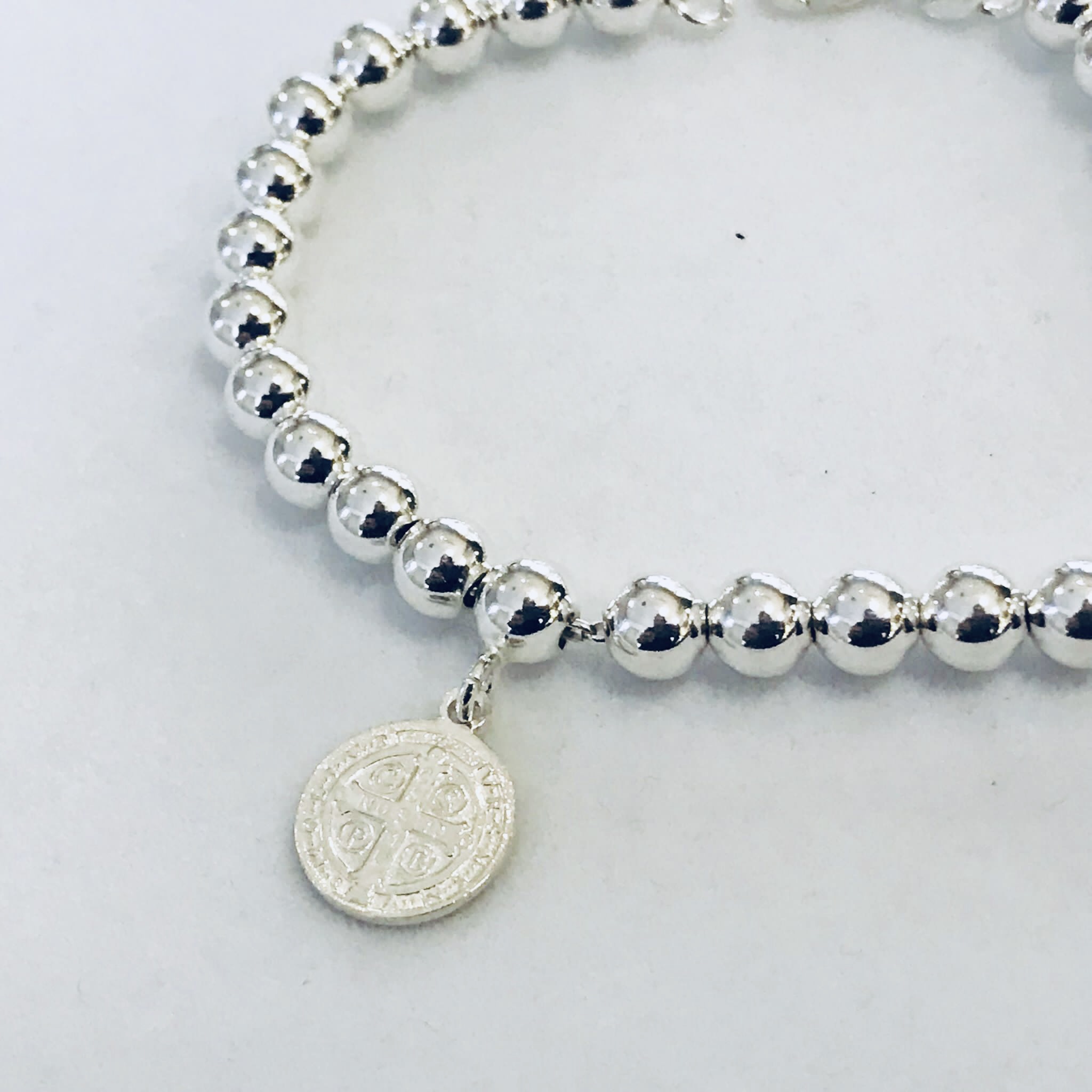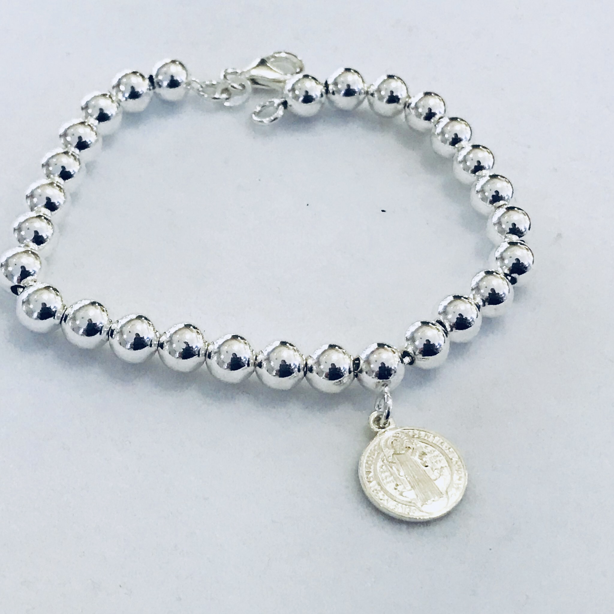 Pulsera plata bolas 6mm , medalla imagen San Benito .